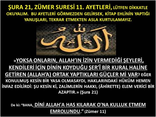 ŞURA 21, ZÜMER SURESİ 11. AYETLERİ LÜTFEN DİKKATLE OKUYALIM. BU AYETLERİ GÖRMEZDEN GELİRSEK, KİTAP EHLİNİN YAPTIĞI YANLIŞLARI, TEKRAR ETMEKTEN ASLA KURTULAMAYIZ.
