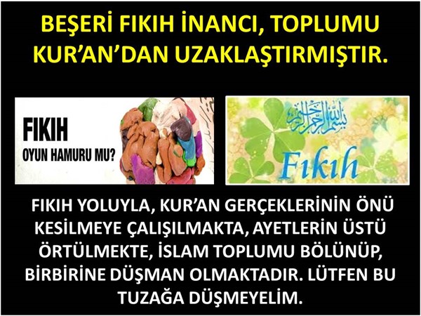 İslam inancında yaratılan fıkıh anlayışı, Müslüman tolumu Kur’an'dan uzaklaştırmış, dinde bölünmemizi sağlayıp birbirimize düşman olmamıza neden olmuştur. Allah Kur’an'ın sınırlarını aşmayın sakın diye uyarır. Dinin anlaşılması ve yaşanması adına getirilen beşeri fıkıh anlayışı, ne yazık ki Müslüman toplumların, Kur’an'ın sınırlarını aşmasına neden olmuştur. DAHA DA KÖTÜSÜ, BU BİLGİLER KUR’AN'IN ÖNÜNE GEÇMİŞ, YALNIZ KUR'AN İLE İSLAM'IN YAŞANMAYACAĞINA TOPLUM İNANDIRILMIŞTIR. Birde her şey Kur’an'da yoktur zihniyetine inandırılmış bir toplumu düşünün lütfen. Dine nifak sokmak isteyen din düşmanları ile dini kendi tekellerine almak isteyen din simsarcıları, FIKIH silahını çok iyi kullanmışlar ve İslam dinini, inanılmaz iftiralarla doldurmuşlardır. Şimdide neyin doğru, neyin yanlış olduğunu anlayan bilen, ne yazık ki çok az.