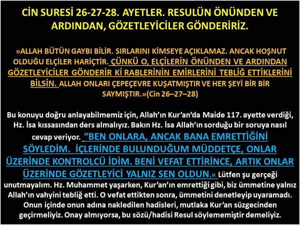 Tekrar etmek istiyorum, onun içindir ki Allah, emin olmadığın bilginin ardına düşmeyin diye bizleri uyarmıştır. Bunları söylediğimizde, rivayet hadisleri de Kur’an ayeti gibi gören kişiler, şöyle bir savunma yapıyorlar. “ALLAH PEYGAMBERİMİZİN HADİSLERİNİ DE, TIPKI KUR’AN GİBİ KORUMA ALTINA ALMIŞTIR.” Her nedense Allah Kur'an'ı ben koruyorum diye apaçık Kur'an'da yazdığı halde, bu yanlış düşünceye inananlar neden Resulün hadislerinin de korunduğu Kur'an'da yok diye sormuyorlar. Onun içindir ki böyle yanlış ve batıl sözlere inanmak, dipsiz bir kuyuya atlamaktan farksızdır. Örneğini verdiğimiz Cin suresinde, Allah elçisine ilettiği bilgileri, melekleri tarafından izlettiğini ve doğru tebliğ edilip kayda alınıp alınmadığını kontrol ediyorsa bunun dışında, hatta Resulün vefatından yüzlerce yıl sonra kayda alınmış hadislerin/sözlerin, doğruluğuna nasıl inanırız. Allah Kur'an'da bahsetmediği halde, onları da Allah koruyor nasıl deriz. Bunu söylemek ve inanmak Kur’an'a şirk koşmaktır, kendimizi aldatmaktır lütfen unutmayalım. Sizlere Kur'an'dan mahşer günü Hz. İsa'nın bir örneğini vermek istiyorum. Ayeti önce yazalım.
