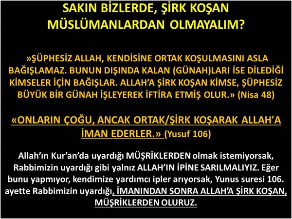 Rabbimiz Kur’an'da kendisine şirk koşanı, asla bağışlamayacağını söyler bizlere. Çünkü şirk koşmak büyük günahtır. Bu konudaki uyarı ayetini önce yazalım, daha sonra Allah şirk koşmakla neyi kast ediyor, onu birlikte anlamaya çalışalım. Eğer doğru anlayamazsak, Allah'a şirk koşan Müslümanlardan olmaktan kurtulamayacağımız gibi, farkında olmadan şirk koşan MÜŞRİKLERDEN oluruz.