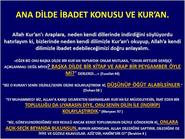 Bu kadar açık ayetlerden sonra, hala Kur'an'ı anladığımız dilden okuyup, anladığımız dilden ibadet edilip edilemeyeceğini tartışıyorsak, bir yerlerde mutlaka bir virüs var demektir. Önce o virüsü temizlemek için virüs programını Kur'an'dan almalıyız, yoksa imanımız bir gün mutlaka çökecektir. Ana dilde ibadet yapmanın günah olduğunu söyleyenlere, namazda Allah'tan kendi dili ile yardım isteyemeyeceğini savunanlara, aynı mantıkla şunu sormak isterim; Arapça bilmeyen bir Türk toplumu ve Arapçadan başka dile tam olarak çevrilmeyen bir kitap ve Allah herkesin anlayamayacağı bir rehber gönderip, daha sonrada bizi bu kitaptan mı hesaba çekecek?