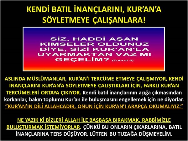 Bir bilim adamı buluşunu kitaplaştırıp, her dile çeviriyor ve dünyada tüm okullarda öğrenciler bu bilgileri, kendi dillerine çevirip okuyup öğreniyorlar ve bilim adamı oluyorlar. Hiç kimse, bu kitabın orijinali Arapça, Japonca, İngilizce bizim dilimize tam olarak çevrilemez, anlamı değişir demiyor okuyor faydalanıyor. Arapça yazılmış ama farklı dillere çevrilmiş o kadar çok kitap var ki, hiç birisini çevirirken farklı çevirmemişler. Ama iş Allah’ın kitabı Kur’an’a gelince, KUR’AN HER DİLE ÇEVRİLEMEZ, BİR KELİMENİN BİRÇOK ANLAMI VARDIR SİZ BİLEMEZSİNİZ, GERÇEK KUR’AN ARAPÇA OLANDIR, ÇEVİRİSİ ASLA KUR’AN OLAMAZ DİYEREK, TOPLUMUN KUR’AN İLE BULUŞMASINI ENGELLİYORLAR. BÖYLECE KENDİ BATIL İNANÇLARINI, KUR’AN’A SÖYLETMEYE ÇALIŞIYORLAR. Onun içinde onlarca, yüzlerce Kur’an tercümesi ortaya çıkıyor ve herkeste kendi tercümesinin en doğru olduğuna inanıyor. ASLINDA MÜSLÜMANLAR, KUR’AN’I TERCÜME ETMEYE ÇALIŞMIYOR, KENDİ İNANÇLARINI KUR’AN’A SÖYLETMEYE ÇALIŞTIKLARI İÇİN, FARKLI KUR’AN TERCÜMELERİ ORTAYA ÇIKIYOR. Batıl inançlardan kurtulamadığımız sürece, Kur'an yanlış tercüme edilmeye devam edilecektir. Bunun tek bir nedeni var, batıl inançlarının açığa çıkmasını istemeyenler, Kur’an’ın kendi batıl inançlarına izin vermediğinin ortaya çıkmasını gizlemek adına, bu çabanın yapıldığı çok açıktır.