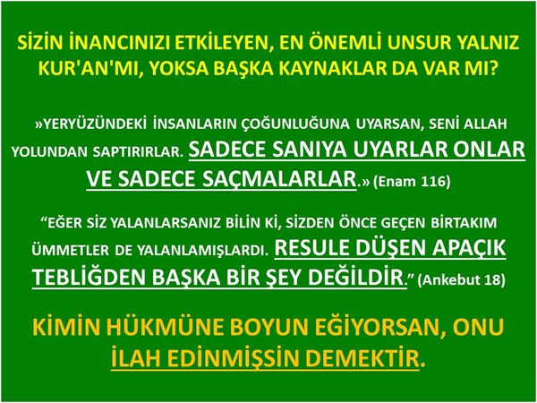 Aynı konu üzerinde Kur’an’dan örnek vermeye devam edelim. Allah Zuhruf 44. Ayetinde, özellikle bizlere bir hatırlatma yapıyor ve diyor ki, SİZLERİ KUR’AN’DAN HESABA ÇEKECEĞİM. Bir başka ayetinde de YALNIZ KUR’AN’IN İPİNE SARILIN diyorsa, sizce Kur’an’ın yanında sarılacak başka kitaplar koyabilir miyiz? Kur’an’ın bir başka ayetinde, SAKIN ALLAH’IN KOYDUĞU HADDİ, SINIRLARI AŞMAYIN uyarısını da unutmayalım. Sanırım bu örneklerden sonra şunu çok açık söyleyebiliriz. BİR MÜSLÜMAN’IN İMANINI, İNANCINI ETKİLEYEN TEK KAYNAK VARDIR, ODA YALNIZ KUR’AN’DIR. Bunun aksini söyleyen, Allah’ın dinine şirk koşmuş olur lütfen unutmayalım. Allah’ın dinine hükümler koyanların olduğuna inanıyorsak, onları da Allah’ın yanında İLAH ediniyoruz demektir.