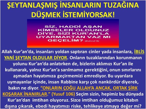 Allah Kur’an’da, insanları yoldan saptıran cinler ya da insanlara, İBLİS YANİ ŞEYTAN OLDULAR DİYOR. Onların tuzaklarından korunmanın yolunu Kur’an’da anlatırken de, bizlerin aklımızı Kur’an ile kullanarak, yalnız Kur’an’a sarılmamız gerektiğini, onun sınırlarını aşmadan hayatımıza geçirmemizi emrediyor. Bu uyarılara uymayanlar içinde, insan Rabbine karşı çok nankördür diyerek, bakın ne diyor. “ONLARIN ÇOĞU ALLAH’A ANCAK, ORTAK ŞİRK KOŞARAK İNANIRLAR.” (Yusuf 106) Seçim sizin, hepimiz bu dünyada Kur’an’dan imtihan oluyoruz. Sizce imtihan olduğumuz kitabın dışına çıkarak, ebedi hayatımızı riske, tehlikeye atmaya değer mi?
