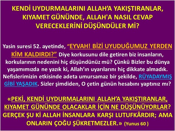 Dikkat ettiyseniz mahşer günü dirilen, canlanan tüm insanlarda, çok büyük bir şaşkınlık var. Eyvah diyorlar, peki neden eyvah diyorlar? Çünkü bizler bu dünyada yaşarken genel çoğunluğumuz, HİÇ HESAP VERMEYECEK GİBİ YAŞIYORUZDA ONDAN. Hepsi de tekrar dirildiğinde, kendilerinin rüyada olduğunu söylüyorlar ve bizi kim uyandırdı diyorlar. Buradan şunu anlıyoruz ölen yakınlarımız, tıpkı bu dünyada bizlerin gece uyuduğumuzda gördüğümüz rüyayı, mahşer günü dirilene kadar görüyorlar. YANİ HEPSİ BİZİM ANLAYACAĞIMIZ ŞEKLİYLE, RÜYA ÂLEMİNDE BEKLETİLİYORLAR. Diriltilip uyandıklarında da, her söylenenin yani Kur’an’da bahsedilenlerin, gerçek olduğu ortaya çıkınca korkulacağı anlaşılıyor. Bu ayetten sonra şunu sanırım rahatlıkla söyleyebiliriz.