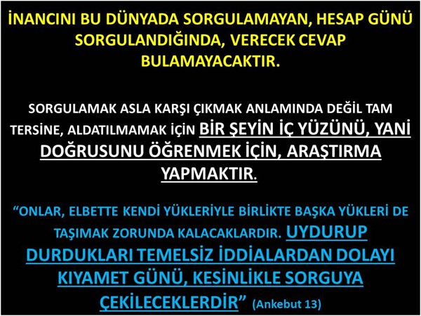 Bizler bu dünyada en küçük bir mal, eşya aldığımızda elimizden geldiğince araştırıyor sorgulayıp alıyorsak, neden imanımızın doğruluğunu, sorumlu olacağımız Kur’an’dan sorgulamıyoruz? YOKSA ALDIĞIMIZ ARABA, EV İMANIMIZDAN DAHA MI KIYMETLİ? İmanını sorgulamayan, yani doğru yolda olup olmadığı konusunu Kur’an’dan araştırma gereği duymayan, inancını ciddiye almıyor değer vermiyor demektir. Gelin bu hatamıza son verelim ve bizleri Allah ile aldatanların tuzağını fark edebilmek için, elimizde bizlerin sorumlu tutulacağımız Kur’an ile yaşadığımız İslam’ın doğruluğunu sorgulayalım.