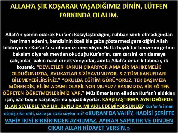 Kur’an ile gereken bağı kuramadığımız için, akılla mantıkla izah edilemeyecek saygısızlığı Kur’an’a yapıyor, doğruluğundan asla emin olamayacağımız, Resule ait olduğu iddia edilen rivayet hadislerle Kur’an’ı, bakın nasıl eşit tutarak ne diyoruz. “KURAN'DA VAHİY, HADİSİ ŞERİFTE VAHİY İKİSİ BİRBİRİNDEN AYRILMAZ. AYIRAN SAPIKTIR VE DİNDEN CIKAR ALLAH HİDAYET VERSİN.” Bunun şirk olduğunu fark edemeyene Kur’an’dan bahsetmek, ayetlerden örnek vermek ne yazık ki fayda etmiyor. Şirk, başka bir ilaha, Allah’a inanmak değildir. Şirk Allah’ın yetkisini gücünü, yaratılmış bir beşere vererek onu ilahlaştırmak demektir ve Allah bunu yapanları affetmem diyor. Böyle yapanlara Kur’an müşrik diyor. Hatırlatırım müşrik iman etmiş, ama imanını gereği gibi yaşamayan demektir. Rabbimiz iman edenlerin çoğunun, bakın nasıl iman ettiğini söylüyor Yusuf 106. ayetinde. “ONLARIN ÇOĞU ALLAH’A ANCAK, ŞİRK/ORTAK KOŞARAK İNANIRLAR.” Kur’an’ın indiriliş amaçlarından biriside, iman ettiğini zanneden müşriklerin yanlışlarını düzeltmek adınadır. Çünkü Rabbimiz ben hükmüme hiç kimseyi ortak etmem diyor. Ortak etmeye çalışanlara da bakın ne diyor.