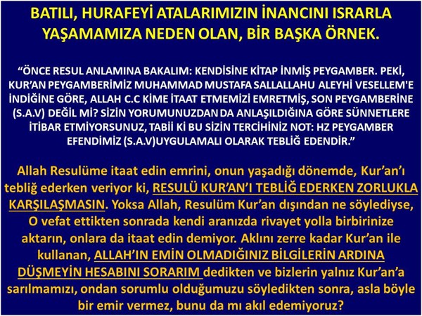 “ÖNCE RESUL ANLAMINA BAKALIM: KENDİSİNE KİTAP İNMİŞ PEYGAMBER. PEKİ, KUR’AN PEYGAMBERİMİZ MUHAMMAD MUSTAFA SALLALLAHU ALEYHİ VESELLEM'E İNDİĞİNE GÖRE, ALLAH C.C KİME İTAAT ETMEMİZİ EMRETMİŞ, SON PEYGAMBERİNE (S.A.V) DEĞİL Mİ? SİZİN YORUMUNUZDAN DA ANLAŞILDIĞINA GÖRE SÜNNETLERE İTİBAR ETMİYORSUNUZ, TABİİ Kİ BU SİZİN TERCİHİNİZ NOT: HZ PEYGAMBER EFENDİMİZ (S.A.V)UYGULAMALI OLARAK TEBLİĞ EDENDİR.”