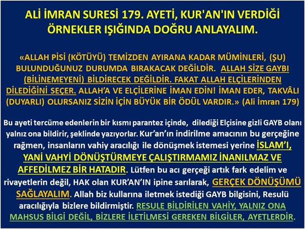 Bu makalemde sizlerin üzerinde düşünmenize vesile olmak istediğim ayet, Ali İmran 179. Ayet olacak. Bu ayette Allah GAYBIN yani bilemediğimiz ama çok merak ettiğimiz konuları yalnız ALLAH’IN BİLECEĞİNDEN BAHSEDİYOR. Fakat bu ayeti öyle tercüme edenler var ki, adeta Kur'an’ın diğer ayetleri ile taban tabana ters düşebiliyor. Bizler ayetleri anlamaya çalışırken, Kur’an’ın diğer ayetlerinden istifade etmemiz gerekirken, ne yazık ki atalarımızdan intikal eden rivayet sözlerin/hadislerin etkisiyle ayetleri anlamaya çalıştığımız için, ayetleri yanlış anladığımız gibi, Allah’ın ayetini tahrif edip kendi inancımızı Allah‘a adeta söyletmeye çalışıyoruz. Konuyu daha iyi anlayabilmemiz için, Ali İmran suresi 179. Ayeti, iki farklı tercümeden yazalım.