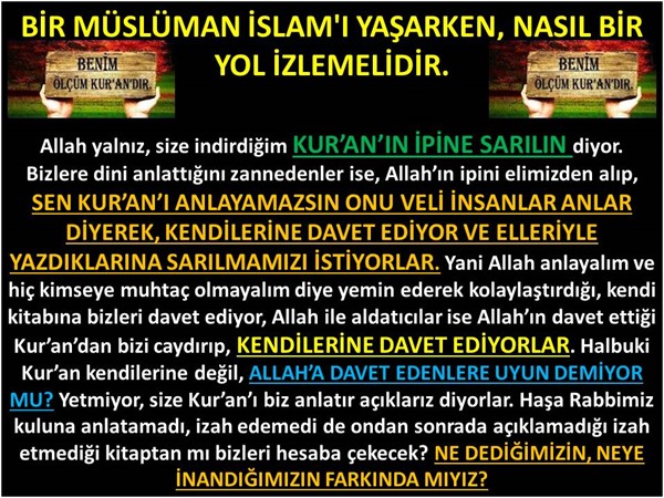 Aslında Kur’an’ı dikkatle okuyup, üzerinde düşünene her şey çok açık. Allah bizleri bu dünyada imtihandan geçirdiğini söylüyor ve birçok ayetinde YEMİN OLSUN Kİ BU KİTABI, ANLAYIP HİÇ KİMSEYE MUHTAÇ OLMAYASINIZ DİYE KOLAYLAŞTIRDIK diyorsa, lütfen Allah’a güvenelim aldatıcılara değil. İMTİHAN KİŞİYE ÖZELDİR VE TEK BAŞINA OLUR. Birilerine ya da guruplara, cemaatlere tabi olarak imtihan verilmez. Lütfen bu gerçeğin artık farkında olalım ki, birileri bizleri şirkin bataklığına batırmasın. Rabbimiz aslında bu konuda bizlere doğru yolu gösteriyor ve bakın nereye sarılın, tabi olun diyor.