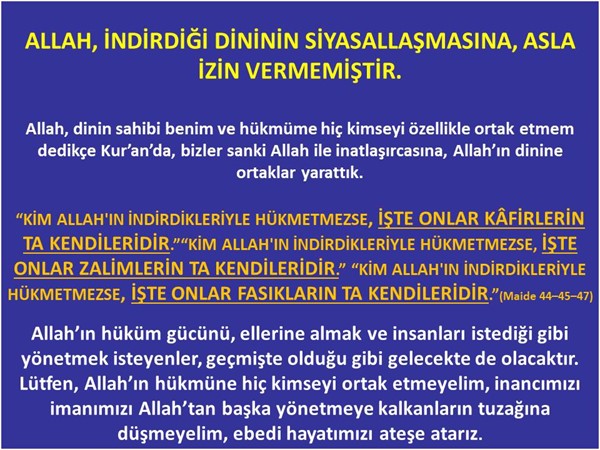 Sanırım dinin siyasallaştırma çabalarının geçmişte, günümüzde hatta gelecekte her zaman yapılacağını, lütfen unutmayalım. Rabbimiz kendi hükmüne hiç kimseyi ortak etmeyeceğini, dinin sahibinin yalnız kendisi olduğunu söylediği halde, hala beşeri oluşumlar olan mezheplerin, dine yaptığı ilaveleri, dinin emri gibi gösterip onunla hükmetmeye çalışanlar, Allah’ın dinini siyasallaştırıp kendi çıkarlarına kullanmaya çalıştıklarını lütfen unutmayalım. Rabbimizin bu konuda bir uyarısını hatırlatmak isterim.