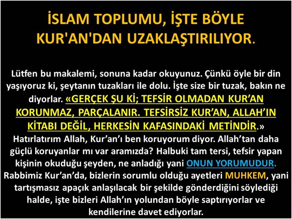 Peki soralım kendilerine, kimin Kur’an tefsirini okuyalım en doğrusudur, ya da İslam’ı kimden öğrenelim? Günümüzde öyle Kur'an tefsirleri var ki, Allah'ın ayetlerinin tam tersini tefsir etmişler. Bunlara mı güvenelim? İşte bu yolu Müslümanlara tavsiye edenlerin, yakın zamanda acısını çektik, hala çekmeye devam ediyoruz, sanırım ismini vermeme gerek yok. Bu düşünce Müslümanlara kurulan bir tuzaktır, farkında olmak isteyen Allah’ın emrettiği gibi YALNIZ KUR’AN’A SARILIR. MÜSLÜMANLAR İŞTE BÖYLE YÜZLERCE YILDIR KULLANILIYOR VE İSTEDİKLERİ GİBİ YÖNETİLİYOR. BU TUZAĞI KURANLARIN BAŞINDA, YAHUDİLERİN GELDİĞİNİ LÜTFEN UNUTMAYALIM. Düşünebiliyor musunuz Kur’an’ın tam tercüme edilemeyeceğini, herkesin Kur’an’ı anlayamayacağını bu topluma kabul ettirip, bizleri Allah ile aldatmaya devam ettikleri gibi, kendilerine geçim kaynağı yaptılar milyarlara hükmediyorlar. Bu kişiler eğer Kur’an’ı çok değil, bir kez kendi dillerinden anlayarak ve düşünerek okumuş olsalardı, Allah’ın yemin ederek Kur’an’ı kolaylaştırdığını, hiç kimseye muhtaç olmayalım diye, nice örneklerle bizzat açıkladığını söylediğini görebileceklerdi. Ne yazık ki Rabbimizi ne duyan ve ne de dikkate alıp Allah'a güvenen var. Varsa yoksa rivayetler sanı bilgiler. Hatırlatırım Rabbimiz bu konuda ne diyordu? “GERÇEK HAK OLAN, RABBİNDEN GELENDİR. O HALDE KUŞKULANANLARDAN OLMA!” (Bakara 147)