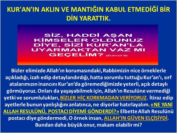 Gerçekten de Allah bu üç görevi Resulüne vermiş mi, yoksa Allah’ın vermediği yetkileri, sırf atalarımızın inancını yaşayabilmek için bizler mi vermeye çalışıyoruz? Bu söylenenler sizce, Kur’an’a göre doğru olabilir mi? Önce şöyle düşünelim. Hiç Kur’an’ı anlayarak okumamış olalım. Bu sözlenenlerin üzerinde, aklı başında bir insan nasıl düşünür? Allah madem insanların doğru yola ulaşması için bir rehber kitap gönderiyor, BU KİTAPTA EMRETTİKLERİNİ NEDEN AÇIKLAMASIN? Neden Resulüne açıklama ve hayata geçirme görevini versin? Bugün Allah’ın Resulünün kendisi aramızda yok. Bu bilgiler Kur’an’da detaylı yoksa günümüze bizlere rivayet ve söylenti yoluyla gelen bilgiler ışığında mı Allah, hükümlerini hayatımıza geçirmemizi yaşamamızı istiyor? YADA KUR'AN YALNIZ RESULÜNÜN DÖNEMİ İLE Mİ SINIRLI? Bakın bu söylediklerinin doğru olduğunu düşündüğümüzde aklın, mantığın ve Kur'an'ın onaylamayacağı sorular çıkıyor. Demek ki söyledikleri, doğru bir yol yöntem asla olamaz. Bu söylenti ve rivayetler ile de doğru bir din yaşanmaz, yüzlerce yıl insanların nakli ile gelen bilgilerin arasına, mutlaka yanlış bilgilerin karışması kaçınılmazdır der, aklı başında hiç kimse buna inanmaz. Ne dersiniz? Bakın vahiyden hiç nasibini almamış, ama aklını kullanan bir insan bunu rahatlıkla söyler. Dinimizi elimizden alan Yahudi fitnesi ve çıkar çevreleri bu gerçek fark edilmesin diye de, AKILLA İSLAM YAŞANMAZ mantıksızlığını, ne yazık ki Müslümanlara, cemaat ve tarikatlar aracılığıyla kabul ettirmişlerdir.
