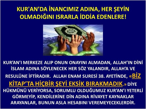 Allah Kitapta, BİZ HİÇ BİR ŞEYİ EKSİK BIRAKMADIK diyorsa, bunu farklı anlamlara çekip, TAM TERSİNİ KANITLAMA ÇABASI İÇİNE GİRMEYELİM. Lütfen şunu unutmayalım. Dinin sahibi Allah olduğu için, Kur’an Allah katından geliyor bizlere, ona hiç kimse ilave edemeyeceğini, yine Kur'an söylüyor. Din ve inancımız adına, sorumlu tutulacağımız bütün bilgilerin, Kur’an’da olmadığını söylersek ve bunu savunursak, HÂŞÂ Allah bizlere gerektiği bilgileri yeteri kadar vermeyen, bizleri rivayetlere ve beşeri sözlere muhtaç eden, daha sonrada bu kitaptan hesap soracağını söyleyen, konumuna getirmiş oluruz ki, bunu hiç birimiz kendimize bile isnat edilmesini istemeyiz. Bizim yaptığımız bu yanlışı Kitap Ehlide araştırıp Allah'ın kitabı ile yetinmedikleri için bakın, Allah nasıl ayetler indirip uyarmış.