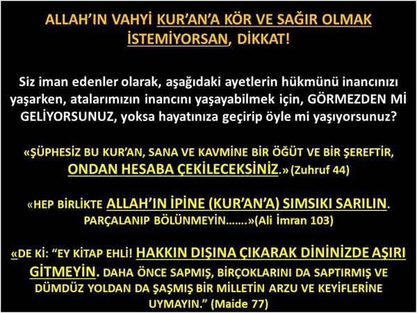 Gerçekten de bizler İslam’ı yaşadığımızı söylüyoruz ama Allah’ın indirdiği Kur’an’a karşı İNANIN KÖR VE SAĞIR OLDUK. Böyle olunca kalplerimiz Kur’an ışığıyla aydınlanamadı, onun nuru ile nurlanmadığı için KALPLERİMİZ TAŞ KESTİ, GERÇEKLERİ HİSSEDEMEZ GÖREMEZ OLDU. Çok daha kötüsü çoğunluğumuz kör ve sağır olduğumuzun, inanın zerre kadar farkında değiliz. Bu konuda birçok makale yazdım ve din kardeşlerimin inancını bizzat kendilerinin sorgulaması gerektiğini hatırlatmaya çalıştım, bu makalemde de hatırlatmaya çalışacağım. Çünkü inanın bu hatamız çok büyük, bu can bu bedenden ayrılmadan, mahşer günü pişman olmak istemiyorsak, mutlaka bunun farkında olmalıyız. Size çok değil Kur’an’dan üç anahtar ayet hatırlatmak istiyorum. Sizce biz Müslümanlar Allah’ın bu uyarı ve ikazları ışığında mı inancımızı yaşıyoruz? Eğer bu ayetleri, bizlere öğretilen atalarımızın inancını yaşayabilmek için görmezden, duymazdan geliyorsak inanın ne yaparsak yapalım, Allah'ın dini İslam'ı doğru anlamamız ve yaşamamız asla mümkün olmayacaktır.