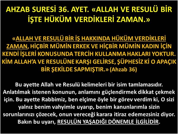Ahzab 36: ALLAH VE RESULÜ BİR İŞ HAKKINDA HÜKÜM VERDİKLERİ ZAMAN, hiçbir mümin erkek ve hiçbir mümin kadın için kendi işleri konusunda tercih kullanma hakları yoktur. Kim Allah'a ve Resulüne karşı gelir, şüphesiz ki o apaçık bir şekilde sapmıştır. (Diyanet Meali)