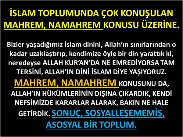 Gelelim bu konuda ki günümüz İslam toplumlarının, namahrem kelimesine verdiği anlama. Bizler Kur’an’ın yani Allah’ın asla hüküm vermediği konularda, mezheplerin cemaatlerin verdiği hükümlerle İslam’ı yaşamaya alıştığımız için, her konuda olduğu gibi bu konuda da inanılmaz Allah adına, HÜKÜMLER VEREBİLİYORUZ. Küçük bir örnek. “BİR KİŞİ, EVLENMESİ HARAM OLMAYAN NÂMAHREM KİMSELERLE BAŞ BAŞA KALAMAZ.” Bu hükmü kim verdi, Allah mı? Elbette hayır. Hani Rabbimiz, ben hükmüme hiç kimseyi ortak etmem diyordu, ne oldu unuttuk mu? İyide baş başa yalnız kalan kadın ve erkeğin ne yapabileceği düşünülüyor da, böyle bir hüküm verebiliyorlar. Bunu söyleyeceklerine, bir kadın ya da erkek Allah’ın Kur’an’da emrettiği şekilde, edebiyle giyinmeli ve takva sahibi olmalı saygılı ve terbiyeli konuşmalı. Üslubuna dikkat etmelidir denmesi gerekmez mi? Kur’an terbiyesi almış bir kadın ve erkek herhangi bir konuyu konuşmak için, baş başa kalsa sizce birilerinin aklına gelen o sapkın düşünce, onların aklına gelir mi? Kendimizi Kur’an ile terbiye edemediğimiz için, bakın nasıl önlemler almaya çalışıyoruz. Bu konuyu o kadar ileri götürmüşüz ki, toplumuzda kadın ve erkeğin baş başa kalamayacağını kabul ettirebilmek için ATEŞ İLE BARUT YANYANA DURMAZ örneğini bile vermişiz. Düşünebiliyor musunuz birbirimizi nelere benzetiyoruz. Bu toplum sizce sosyalleşebilir mi?