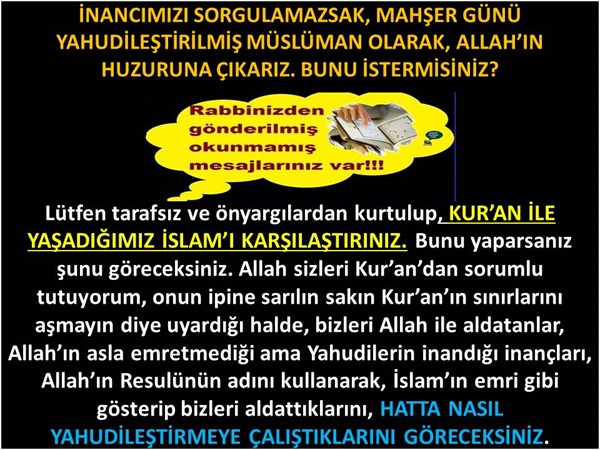 Sizlere sorsam ve desem ki, Allah’ın huzuruna mahşer günü YADİLEŞTİRİLMİŞ ALLAH İLE ALDATILMIŞ BİR MÜSLÜMAN OLARAK ÇIKMAK İSTERMİSİNİZ? Elbette istemeyiz diyeceksiniz. İstemiyorsanız lütfen imanınızı sorumlu olduğumuz Kur’an ile sorgulayınız. İsterseniz gelin birlikte kısa bir sorgulama yapalım, acaba farkında olmadan Yahudileşme yolunda yol mu alıyoruz, yoksa Allah’ın emrettiği gibi İmanımızı, KUR’AN’IN SINIRLARINDA MI YAŞIYORUZ. Rabbimiz Zuhruf suresi 44. Ayetinde, sizleri Kur’an’dan sorumlu tutuyorum emrine itaat edip, Kur’an ne emrediyorsa ne kadar açıklama yaptıysa onu öğrenip inancımızı mı yaşıyoruz, yoksa yalnız Kur’an ile İslam yaşanmaz diyerek, Allah'ın dinine beşeri ikinci bir kaynak yaratıp, özellikle Yahudilerin inancımıza sokmaya çalıştığı, rivayetleri de İNANCIMIZ ADINA YAŞIYOR MUYUZ? Hatırlatırım Rabbimiz, ben hükmüme hiç kimseyi ortak etmem diyor.