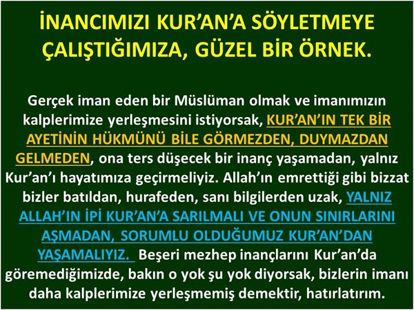Bu ve benzeri rivayet asıllı beşeri kaynaklar, İslam toplumunu Allah’ın yolundan işte böyle saptırmıştır. Allah Kur’an’da biz her türlü misali örneği değişik şekilde verdik, KUR’AN’I AÇIKLAMAK BİZİM GÖREVİMİZDİR dediği halde, bizler Allah’ın kitabına güvenmeyip, kendimize güvenecek kitaplar rivayetler ve sanı bilgiler edinip onlar olmadan, ne namazımızı kılabiliriz neden hacca gidip zekâtımızı verebiliriz diyebiliyoruz. Bu tavır Kur’an’ı yetersiz görüp küçümsemektir. Çok daha ilginç olanı fetva makamını istediğimiz gibi genişletip, (DİP fetva) Diyanet İşleri Başkanlığının bile din adına fetvalar verebileceğine inandırıldık. Lütfen araştırınız, öyle fetvalar gördük ki, zaman geçtiğinde aynı fetvanın tam tersini verebiliyorlar. Bu durumda kim sorumlu olacak? Fetvayı veren mi? ZİKİR EHLİ ŞUNU ÇOK AÇIK BİLİR. HERKEZİN KENDİSİ, BİZZAT YAPTIKLARINDAN SORUMLUDUR. SORUMLU OLDUĞUMUZ KİTABINDA ALLAH, YALNIZ KUR’AN OLDUĞUNU SÖYLÜYOR.