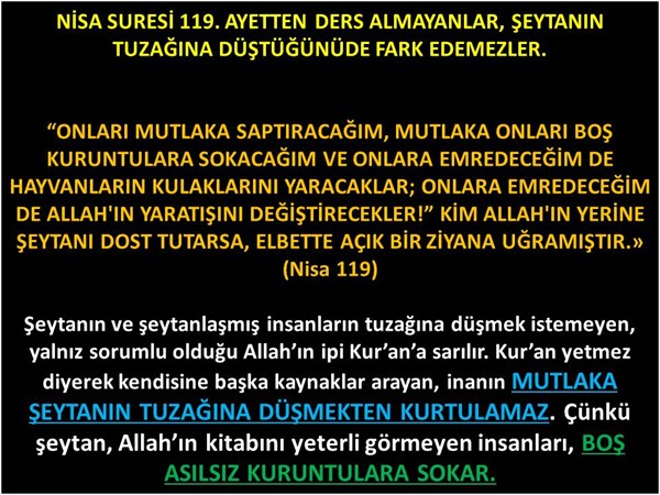 Nisa 119 : “ONLARI MUTLAKA SAPTIRACAĞIM, MUTLAKA ONLARI BOŞ KURUNTULARA SOKACAĞIM VE ONLARA EMREDECEĞİM DE HAYVANLARIN KULAKLARINI YARACAKLAR; ONLARA EMREDECEĞİM DE ALLAH'IN YARATIŞINI DEĞİŞTİRECEKLER!” KİM ALLAH'IN YERİNE ŞEYTANI DOST TUTARSA, ELBETTE AÇIK BİR ZİYANA UĞRAMIŞTIR. (Bayraktar Bayraklı)