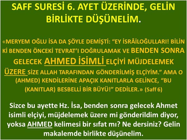 Bu makalemde sizleri Saff suresi 6. Ayet üzerinde, düşünmeye davet etmek istiyorum. Bir çok konuda da yaptığımız gibi, ayetleri tercüme ederken rivayetlerin, doğru olmayan bilgilerin etkisiyle tercüme ediyoruz. Bu ayet de yapılan yanlış üzerinde birlikte düşünelim Önce ayeti diyanetin mealinden yazalım. Şunu da söylemek isterim, ayeti genel çoğunluk aynı tercüme etmişler, lütfen araştırınız.