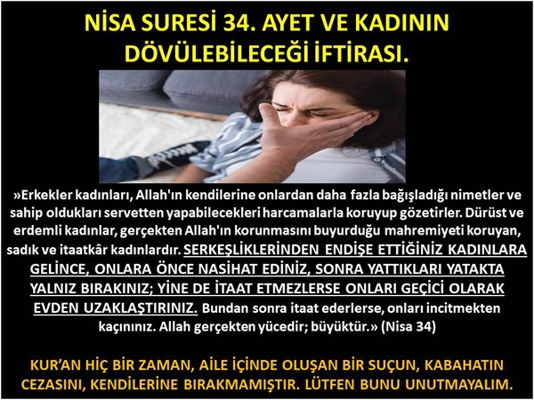 Nisa 34: Erkekler, kadınların koruyup kollayıcılarıdırlar. Çünkü Allah, insanların kimini kiminden üstün kılmıştır. Bir de erkekler kendi mallarından harcamakta (ve ailenin geçimini sağlamakta) dırlar. İyi kadınlar, itaatkârdırlar. Allah’ın (kendilerini) koruması sayesinde onlar da “gayb” korurlar. (Evlilik yükümlülüklerini reddederek) başkaldırdıklarını gördüğünüz kadınlara öğüt verin, onları yataklarında yalnız bırakın. (Bunlar fayda vermez de mecbur kalırsanız) ONLARI (HAFİFÇE) DÖVÜN. Eğer itaat ederlerse, artık onların aleyhine başka bir yol aramayın. Şüphesiz Allah, çok yücedir, çok büyüktür. (Diyanet meali)