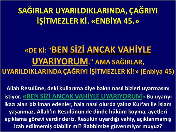 Enbiya 45: De ki: “Ben sizi ancak VAHİYLE UYARIYORUM.” AMA SAĞIRLAR, UYARILDIKLARINDA ÇAĞRIYI İŞİTMEZLER Kİ!