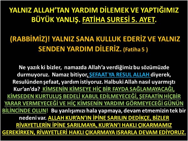 Acaba gerçekten her gün bu sözü verirken Rabbimize, sözümüz de duruyor muyuz dersiniz? Allah Kur’an'da bakın bu konuda, Bakara suresi 123. ayetinde ne diyor. " KİMSENİN KİMSEYE HİÇ BİR FAYDA SAĞLAMAYACAĞI, KİMSEDEN KURTULUŞ BEDELİ KABUL EDİLMEYECEĞİ, ŞEFAATİN HİÇBİR YARAR VERMEYECEĞİ VE HİÇ KİMSENİN YARDIM GÖRMEYECEĞİ GÜNÜN BİLİNCİNDE OLUN! Bu ayete baktığınızda çok açık ve net bir şekilde, hiç kimsenin bir başkasına fayda sağlayamayacağı, yardım edip şefaat edemeyeceği çok açık bildiriliyor. Ama bizler bu ve buna benzer, onlarca ayete inandığımızı söylediğimiz ve her namazımızda iman ettik Allah'ım, yalnız senden yardım dileyeceğiz dediğimiz halde, namazın bitiminde Allah'tan başka öyle şefaatçiler, yardımcılar edindik ki, Allah'ın bu konudaki ayetlerini, uyarılarını hatırlayan, duyan bile yok. Bu yanlışımızı hala yapmaya, devam etmemizin tek bir nedeni var. ALLAH KUR’AN’IN İPİNE SARILIN DEDİKÇE, BİZLER RİVAYETLERİN İPİNE SARILMAYA, KUR’AN’I HAKLI ÇIKARMAMIZ GEREKİRKEN, RİVAYETLERİ HAKLI ÇIKARMAYA ISRARLA DEVAM EDİYORUZ.