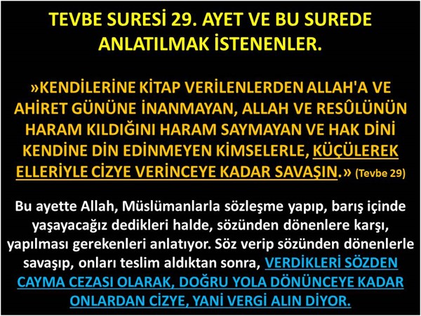Tevbe 29: KENDİLERİNE KİTAP VERİLENLERDEN ALLAH'A VE AHİRET GÜNÜNE İNANMAYAN, ALLAH VE RESÛLÜNÜN HARAM KILDIĞINI HARAM SAYMAYAN VE HAK DİNİ KENDİNE DİN EDİNMEYEN KİMSELERLE, KÜÇÜLEREK ELLERİYLE CİZYE VERİNCEYE KADAR SAVAŞIN. (Diyanet vakfı)