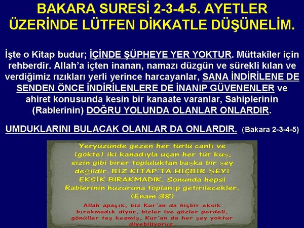 “BU, KENDİSİNDE ŞÜPHE OLMAYAN KİTAPTIR. ALLAH’A KARŞI GELMEKTEN SAKINANLAR İÇİN YOL GÖSTERİCİDİR. ONLAR, GAYBA İNANIRLAR SALATI GÖZETİRLER, KENDİLERİNE VERDİKLERİMİZDEN ALLAH YOLUNDA HARCARLAR. SANA İNDİRİLENE VE SENDEN ÖNCE İNDİRİLENE İMAN EDERLER VE AHİRETE DE ONLAR KESİN OLARAK İNANIRLAR. RABLERİ TARAFINDAN GÖSTERİLEN DOĞRU YOL ÜZERİNDE OLANLAR ANCAK ONLARDIR VE KURTULUŞA ERENLER DE YALNIZCA ONLARDIR. KÜFRE SAPLANANLARA GELİNCE, ONLARI UYARSAN DA, UYARMASAN DA, ONLAR İÇİN BİRDİR, İNANMAZLAR.” (Bakara 2-3-4-5-6)