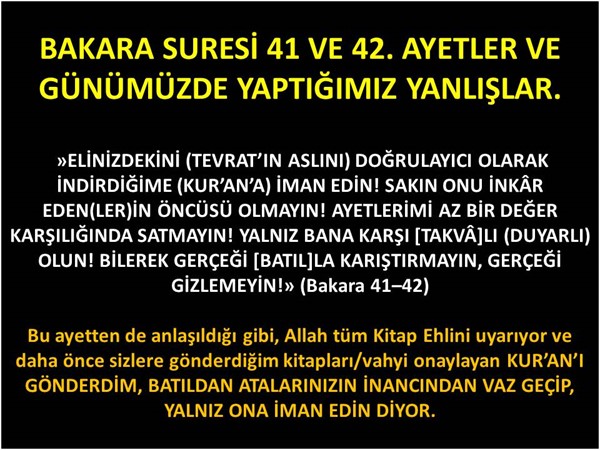 Bakara 41–42: ELİNİZDEKİNİ (TEVRAT’IN ASLINI) DOĞRULAYICI OLARAK İNDİRDİĞİME (KUR’AN’A) İMAN EDİN! SAKIN ONU İNKÂR EDEN(LER)İN ÖNCÜSÜ OLMAYIN! AYETLERİMİ AZ BİR DEĞER KARŞILIĞINDA SATMAYIN! YALNIZ BANA KARŞI [TAKVÂ]LI (DUYARLI) OLUN! BİLEREK GERÇEĞİ [BATIL]LA KARIŞTIRMAYIN, GERÇEĞİ GİZLEMEYİN! (Mehmet Okuyan)