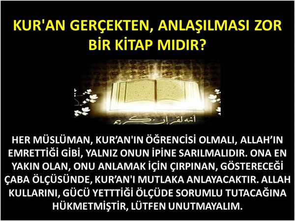Allah bizlere, bütün şan ve şerefiniz Kur’an'da dır diyor ama birileri böyle bir nur için, herkes Kur'an'ı anlayamaz, her bilgi detaylı Kur'an'da yoktur diyerek, toplumu kendilerine rivayetlere çağırabiliyorlar. Ama okumaya yönlendirdikleri beşeri kitapları, her ne hikmetse anlayabiliyoruz. O KİTAPLARI YAZANLAR KİMLER Kİ DOĞRU ANLAMIŞ VE AYETLERİ DOĞRU TERCÜME ETMİŞ, HİÇ BU SORUYU KENDİMİZE SORUYOR MUYUZ? Bu nasıl bir mantık, bu nasıl bir anlayış ki, Allah'ın gönderdiğini bizler anlayamıyoruz, ama sorumlu oluyoruz. Birileri çıkıyor ve ben sizlere ayetleri en doğru şekilde anlatırım, açıklarım siz kendiniz anlayamazsınız diyenlere inanabiliyoruz. HER MÜSLÜMAN, KUR’AN'IN ÖĞRENCİSİ OLMALIDIR. ONA EN YAKIN OLAN, ONU ANLAMAK İÇİN ÇIRPINAN, GÖSTERECEĞİ ÇABA ÖLÇÜSÜNDE, KUR’AN'I MUTLAKA ANLAYACAKTIR. ALLAH KULLARINI, GÜCÜ YETTTİĞİ ÖLÇÜDE SORUMLU TUTACAĞINA HÜKMETMİŞTİR, LÜTFEN UNUTMAYALIM.