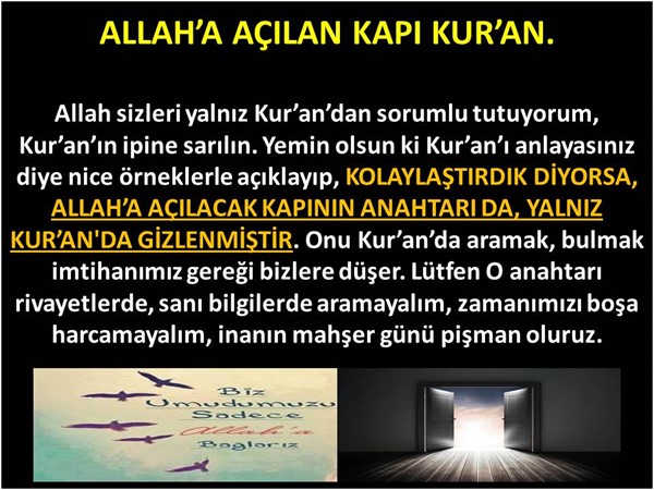 Allah sizleri yalnız Kur’an’dan sorumlu tutuyorum, Kur’an’ın ipine sarılın. Yemin olsun ki Kur’an’ı anlayasınız diye nice örneklerle açıklayıp, KOLAYLAŞTIRDIK DİYORSA, ALLAH’A AÇILACAK KAPININ ANAHTARI DA, YALNIZ KUR’AN'DA GİZLENMİŞTİR. Onu Kur’an’da aramak, bulmak imtihanımız gereği bizlere düşer. Lütfen O anahtarı rivayetlerde, sanı bilgilerde aramayalım, zamanımızı boşa harcamayalım, inanın mahşer günü pişman oluruz.