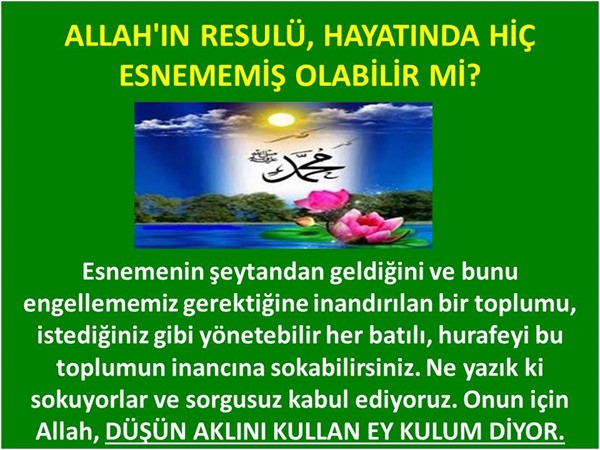 Ne dersiniz, yazımın başında sizlere hatırlattığım rivayet bilgiler, sizce doğru olabilir mi? ALLAH'IN RESULÜ HAYATINDA HİÇ ESNEMEMİŞ OLABİLİR Mİ? Esnemek, sizce şeytandan mıdır, yoksa YÜCE RABBİMİZİN YARATTIĞI KULLARININ EN ÖNEMLİ İHTİYACIMIDIR? Hiç bir insanın, esnemeden yaşayamayacağını bildiğimiz halde, Allah'ın Resulüne apaçık atılan bu iftiraya nasıl inanırız? Lütfen Allah'ın Resulüne ithafen söylenen sözleri akıl ve Kur'an süzgecinden geçirelim. Yoksa Allah'ın yolunda olduğumuzu zannederek, şeytanın yolunda gider ve Allah'ın huzurunda Resulün yüzüne bakamayanların safında buluruz kendimizi. Bizlere düşen Allah'ın rehberiyle yatıp, Allah'ın rehberiyle kalkmak olmalıdır. Eğer bunu yaparsak, dine nifak sokmaya çalışanlar, yanımıza bile yaklaşamazlar. Yok eğer, sen Kur’an'dan anlayamazsın diyenlere kanıp rivayetleri din diye yaşıyorsak ve Kur'an'ı yüksek bir yere asıp birde üstüne üstlük, Allah'ın sakın emin olmadığınız bilginin ardına düşmeyin, Allah'tan başka veli edinmeyin uyarısını göz ardı edip veliler, şeyhler edinmişsek, İŞTE O ZAMAN AKI KARA, KARAYI AK GÖRMEMİZ KAÇINILMAZ OLACAKTIR.