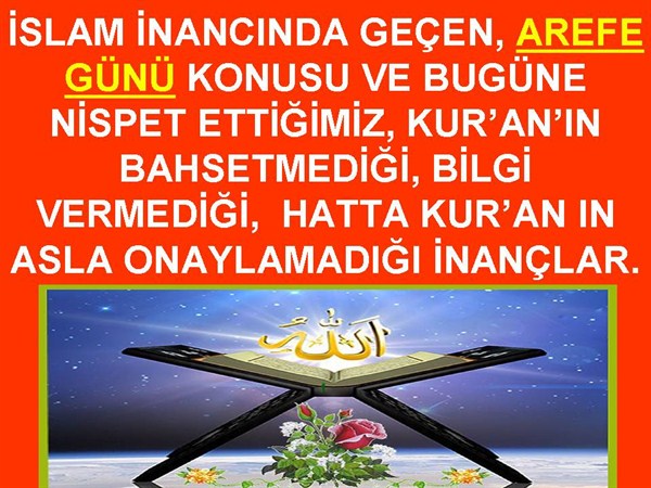 Ramazan bayramı ve Kurban bayramının bir gün öncesindeki günlere, Arefe günü dendiğini hatırlatmak isterim. Bu durumda Allah emri olmayan, Kurban ve Ramazan bayramının bir gün öncesine verilen isim olan Arefe günü, sizce Allah katında çok önemi olan bir gün olabilir mi? EĞER OLSAYDI, BİZLERE ALLAH BİLDİRMEZ MİYDİ KUR’AN'DA? ELBETTE BİLDİRİRDİ. Bizlere gönderilen İlahi hükümlerin, artık tamamlandığını bildiren ( Bugün dininiz tamamlandı) ayeti bugünde nazil olduğunu rivayet etmeleri, acaba bu günü kutsallaştırır mı? Bizler çok özel günleri, kendi nefsimizce edinip, birde o günlere çok özel kutsallıklar yükleyerek neler söylüyoruz. İsterseniz bu gün üzerine yükledikleri, kutsal değerlerden bazı örnekler verelim.
