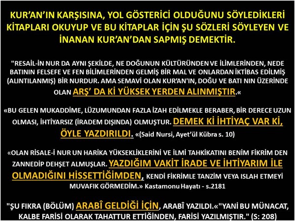 Evet, bu söylediklerimi iddia eden ve günümüzde de, belki de farkında olmadan, bu düşüncenin ardı sıra giden din kardeşlerimiz ne yazık ki var. Bana düşen değerli din kardeşlerimi FURKAN ile uyarmak ve Kur’an gerçekleri ile yüzleşmelerini sağlamaktır. Gerisi kendilerine kalmıştır. Kimin doğru yolda gittiğini, yalnız Rabbim bilir. Lütfen unutmayalım, SÖZ BAKIMINDAN ALLAH'TAN DAHA DOĞRU KIM VARDIR! (Nisa 87) ALLAH'TAN VE O'NUN AYETLERİNDEN SONRA HANGİ SÖZE İNANACAKLAR? (casiye 6) Bu uyarıları yapan Rabbimizdir. Benimde geçmiş yıllarımda, kısmen girip çıktığım, Nur cemaati mensubu kardeşlerim, acaba bahsettiğim kitaplarla ilgili, aşağıda yazılan bilgileri, düşünceyi biliyorlar mı? Ya da bu düşünceleri Kur’an süzgecinden geçirdiler mi? Yazacaklarım üzerinde lütfen dikkatle düşünmelerini, ondan sonra KİME VE NEYE GÜVENECEKLERİNE KARAR VERMELERİNİ rica ediyorum. Çünkü herkes hesabını Allah'a, bizzat kendisi verecektir. Geri dönüşü olmayan yola girdiğimizde, eğer pişman olmak istemiyorsak, bugün çok ama çok dikkatle düşünmenin zamanıdır. Bir Müslüman'a düşen, din kardeşini yalnız ve yalnız KUR’AN ile uyarmaktır. Bakın Risale-i Nur kitaplarının, nereden geldiği yazıyor kitaplarında ve O kitaplara inananlara neler söyleniyor.