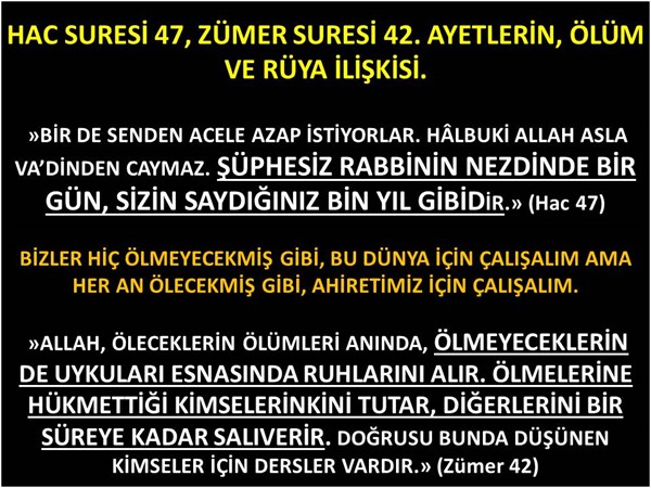 Peki, bu ne anlama geliyor. Allah bizlere ölümü anlatıyor ve diyor ki, aslında sizler uyuduğunuzda, ölümü yaşıyorsunuz. Hakkınızda kesin ölüm kararı verdiğimiz bir daha uyanamıyor, yaşamasına izin verdiklerimiz ise takdir ettiğimiz yaşamın sonuna kadar, ruhlarını iade ediyoruz. Buraya kadar ayet açıkça bizlere bildiriyor. Günümüz ilmi ise, bu konuda son yıllarda, çok daha geniş bilgilere sahip ve gerçekten rüyamızda, Allah'ın katında geçen zaman farkı ile bizlerin günümüzde yaşadığımız zaman farkını, ilimle ortaya çıkarmıştır. Kur’an'ın sözlerinin doğru olduğunu böylece ortaya çıkmıştır. Hem de Allah'ın verdiği RÜYA örneğinden yola çıkarak.