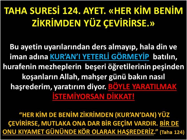 Hangimiz bu cezayla karşı karşıya kalmak ister? LÜTFEN İNANCIMIZI KUR'AN İLE SORGULAYALIM, EN YAKINLARIMIZI BU KONUDA UYARALIM. Kur’an'ı anlamaya çalışmak yerine Kur’an'ı anlattığını, açıkladığını söyledikleri emin olamayacağımız bilgilerin ardına düşenlere, yönünü beşerin sözlerine dönenlere, Allah dar bir geçim, yani üzücü acı, yoksul bir hayat veririm diyor. Mahşer günü ise böyle kişileri batıla hurafe saptıklarından, Allah'ın kitabının gerçeklerini göremedikleri için, KÖR OLARAK YARATIRIM diyor. Bir başka ayetinde de aynı konuyu anlayabilmemiz içinde, AKLINI KULLANMAYANLARI, PİSLİK İÇİNDE BIRAKIRIM DİYE UYARMIŞTI HATIRLAYINIZ. Bu yanlışı yaptığımız için acı ve üzücü gerçekleri göremiyoruz ve Allah Kur’an'da ne emrediyorsa, büyük çoğunlukla tam tersini bizlere, Allah emri diye anlatıyorlar, farkında bile olamıyoruz hatırlatırım. HUZURA VARDIĞIMIZDA ŞAŞIRMIŞLARDAN OLMAK İSTEMİYORSAK, ASLA YÜZÜMÜZÜ, YÖNÜMÜZÜ BİR AN BİLE, KUR’AN'DAN BAŞKA KAYNAKLARA ÇEVİRMEYELİM. O NE EMREDİYORSA, NE KADAR AÇIKLAMIŞSA ONUNLA YETİNİP, HAYATIMIZA GEÇİRMELİYİZ. Kur’an'ın dışından, bunlarda Allah katındandır dedikleri bilgilere hiç şüphe duymadan yönümüzü, yüzümüzü dönersek unutmayalım, Allah'ın zikrinden yüzümü dönmüşüz demektir. Allah çok açık emrini veriyor ve diyor ki, YALNIZ KUR’AN'IN İPİNE SARILIN, KUR’AN'IN SINIRLARINI AŞMAYIN, KÂFİRLERDEN OLURSUNUZ.