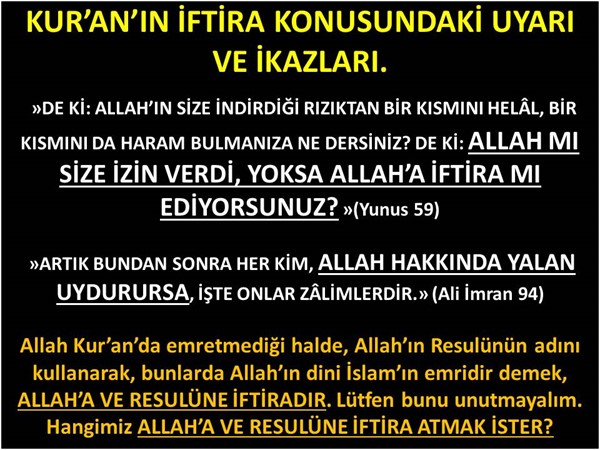 Makalemin konusu İFTİRA. Acaba Kur’an iftira konusuna nasıl bakıyor ve bu konuda nasıl uyarı ve ikazlarda bulunuyor bizlere. Önce iftira atmak, ne anlama geliyor ona bakalım. Bu kelimenin sözlük anlamı, uydurmak, yalan söylemek, asılsız isnatta bulunmak anlamlarına geliyor. Elbette böyle davranışlarda bulunan insanlara karşıda, Kur’an'ın alacağı tedbirler olacaktır. Kur’an'da iftira konusunu, iki bölümde anlatmak istiyorum. Birinci, Allah'a ve Resulüne iftira atmak, ikinci de insanların birbirine ve özellikle kadınlara, namusları iffetleri konusunda iftirada bulunmak anlamında, örneklerle anlatılır. Önce Allah'a iftira atma konusu nasıl anlatılır, neleri kapsar ona bakalım. Önce şunu hatırlatmak isterim. Allah Kur’an’da emretmediği halde, Allah’ın Resulünün adını kullanarak, bunlarda Allah’ın dini İslam’ın emridir demek, ALLAH’A VE RESULÜNE İFTİRADIR. Hangimiz ALLAH’A VE RESULÜNE İFTİRA ATMAK İSTER?