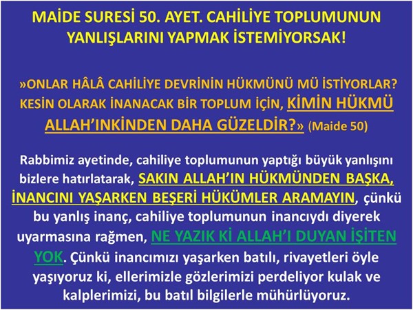 Rabbimiz ayetinde, cahiliye toplumunun yaptığı büyük yanlışını bizlere hatırlatarak, SAKIN ALLAH’IN HÜKMÜNDEN BAŞKA, İNANCINI YAŞARKEN BEŞERİ HÜKÜMLER ARAMAYIN, çünkü bu yanlış inanç, cahiliye toplumunun inancıydı diyerek uyarmasına rağmen, NE YAZIK Kİ ALLAH’I DUYAN İŞİTEN YOK. Çünkü inancımızı yaşarken batılı, rivayetleri öyle yaşıyoruz ki, ellerimizle gözlerimizi perdeliyor kulak ve kalplerimizi, bu batıl bilgilerle mühürlüyoruz. BİR BAŞKA DEYİŞLE, ALLAH'TAN BAŞKA HÜKÜM KOYUCULAR ARAMAK, CAHİLİYE TOPLUMUNUN İNANÇLARIDIR DİYOR YARADAN. Peki, bizler bu uyarılardan ders aldık mı? Cahiliye toplumunun yaptığı yanlışları yapmıyor muyuz? Allah'ın Kur'an'da emrettiği gibi, yalnız Kur'an'ın ipine sarılıp onun sınırlarını aşmadan mı İslam'ı yaşıyoruz? Ne yazık ki hepsini, belki de daha fazlasını bugün bizler yapıyoruz ve diyoruz ki hiç korkmadan, “ALLAH'IN ELÇİSİNİN DE DİNDE HÜKÜM KOYMA YETKİSİ VARDIR. KUR’AN'DA HER BİLGİ YOKTUR, DETAY VERİLMEMİŞTİR. ALLAH'IN ELÇİSİNİN RİVAYET HADİSLERİ OLMASAYDI, NE NAMAZIMIZI KILABİLİRDİK, NEDE ORUCUMUZU TUTABİLİRDİK. KUR'AN KAPALI KALIR, ANLAŞILAMAZDI.”