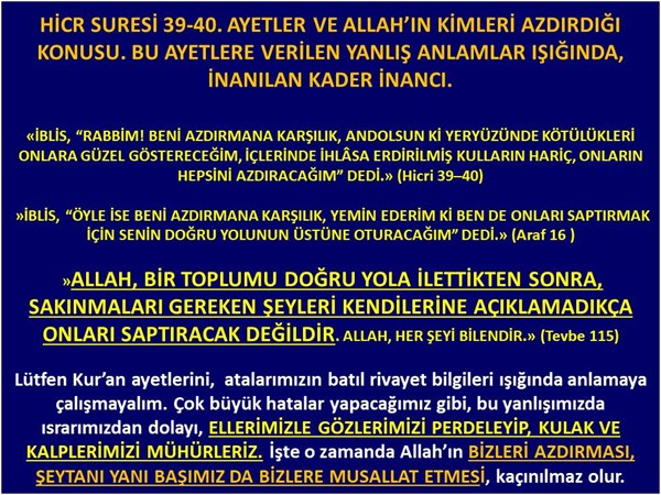 HİCR SURESİ 39-40. AYETLER VE ALLAH'IN KİMLERİ AZDIRDIĞI KONUSU. BU AYETLERE VERİLEN YANLIŞ ANLAMLAR IŞIĞINDA İNANILAN KADER İNANCI.