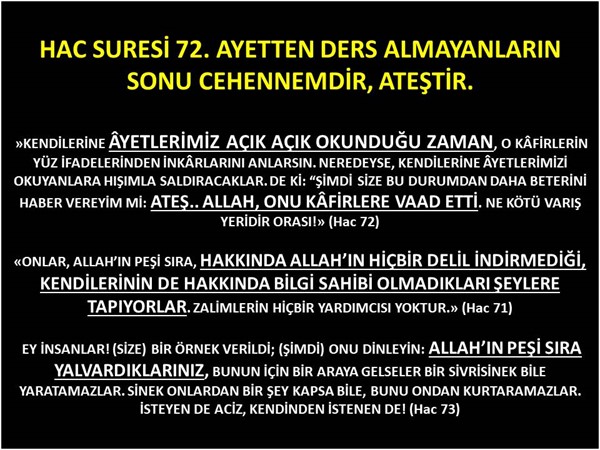 Hac 72: KENDİLERİNE ÂYETLERİMİZ AÇIK AÇIK OKUNDUĞU ZAMAN, O KÂFİRLERİN YÜZ İFADELERİNDEN İNKÂRLARINI ANLARSIN. NEREDEYSE, KENDİLERİNE ÂYETLERİMİZİ OKUYANLARA HIŞIMLA SALDIRACAKLAR. DE Kİ: “ŞİMDİ SİZE BU DURUMDAN DAHA BETERİNİ HABER VEREYİM Mİ: ATEŞ.. ALLAH, ONU KÂFİRLERE VAAD ETTİ. NE KÖTÜ VARIŞ YERİDİR ORASI!” (Diyanet meali)