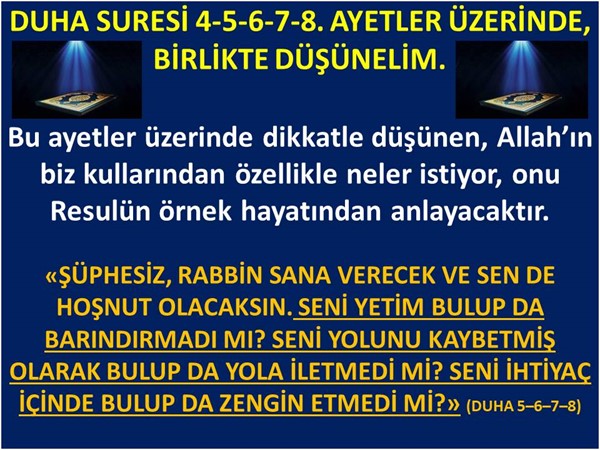 DUHA 5–6–7–8: ŞÜPHESİZ, RABBİN SANA VERECEK VE SEN DE HOŞNUT OLACAKSIN. SENİ YETİM BULUP DA BARINDIRMADI MI? SENİ YOLUNU KAYBETMİŞ OLARAK BULUP DA YOLA İLETMEDİ Mİ? SENİ İHTİYAÇ İÇİNDE BULUP DA ZENGİN ETMEDİ Mİ? (Diyanet meali)