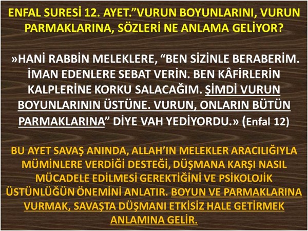 Enfal 12: HANİ RABBİN MELEKLERE, “Ben sizinle beraberim. İman edenlere sebat verin. Ben kâfirlerin kalplerine korku salacağım. ŞİMDİ VURUN BOYUNLARININ ÜSTÜNE. VURUN, ONLARIN BÜTÜN PARMAKLARINA” diye vahyediyordu. (Diyanet meali)
