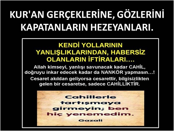 Bu kişiler, yazılarımda Kur’an'ın bahsetmediği onca bilginin detayını Kur’an vermiyorsa, nereden alıyoruz da kabul ediyoruz diye uyarıp, tüm bunların dinimize sokulan Yahudi fitnesi olduğunu söylediğimden, bana kızıyor ve diyorlar ki, ”ADAM KUR’AN’IN DIŞINDAKİ ANLATILAN HER ŞEYE, YAHUDİ FİTNESİ DİYOR VE KESTİRİP ATIYOR" Çok doğru öyle söylüyorum. Çünkü Yahudiler hem İslam dinine, hem de Hıristiyan toplumunun içine bizzat kendi adamlarını sokarak, dinimizi kendilerine benzetmişlerdir. HALA İÇİMİZDELER AMA BİR GÜN AÇIĞA BİRER BİRER ALLAH'IN İZNİYLE ÇIKACAKLAR. AMERİKAYA KAÇAN, TOPLUMU ACIYA VE GÖZYAŞLARINA BOĞAN ZATTA, YAHUDİ AJANIYDI, AMA İÇİMİZDEYKEN BU ŞAHSA HOCA EFENDİ DİYENLER VARDI. BU ZAT ASLA YAHUDİ ALEHTARI TEK BİR SÖZ SÖYLEMEZDİ. BU ZATTAN BAŞKA SİZCE ARAMIZDA, BÖYLE HAİNLER YOK MU? HEPSİNİ BİR GÜN GÖRECEĞİZ İNŞALLAH.