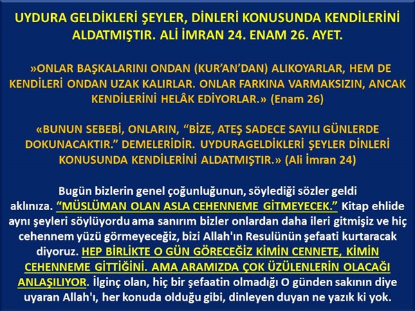 UYDURA GELDİKLERİ ŞEYLER, DİNLERİ KONUSUNDA KENDİLERİNİ ALDATMIŞTIR. ALİ İMRAN 24. ENAM 26. AYET.